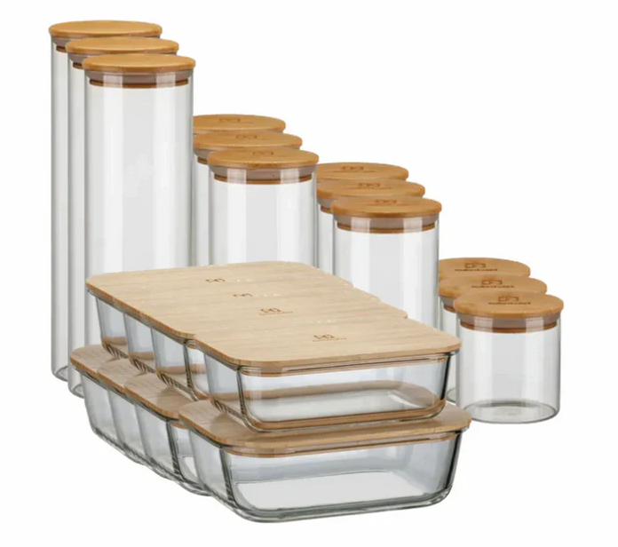 Nosso kit possui 20 Potes Herméticos Porta-Mantimentos com Tampa de Bambu Electrolux que contam com vedação hermética com anel de silicone, o que garante selagem perfeita que ajuda a manter o sabor e as texturas originais. Ideais para armazenar temperos, sementes, farinhas, cereais, grãos, café, macarrão, biscoito, doces, torradas e outros alimentos secos. Outros benefícios incluem: